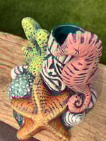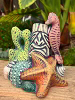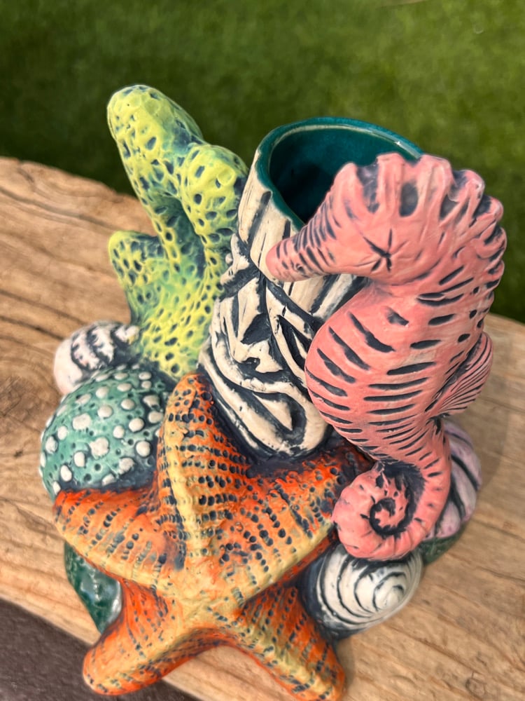 Nestled in among the colorful coral and lively starfish, the seahorse curls its way around a sunken tiki along the ocean floor. Dancing with color and fun coral shapes is this sea life inspired mug.