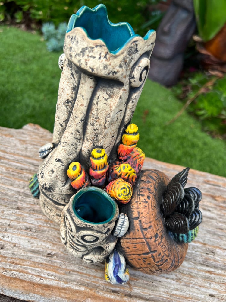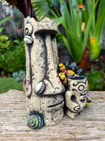 Recovered from the depths, where mussels have found a home among the cork, and coral have overtaken this Moai and mini Marquesan tiki.