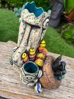Two separate chambers (each mug has its own), but joined as one. Hand sculpted coral, mussels and clamshell, this sunken mug is a fun one.